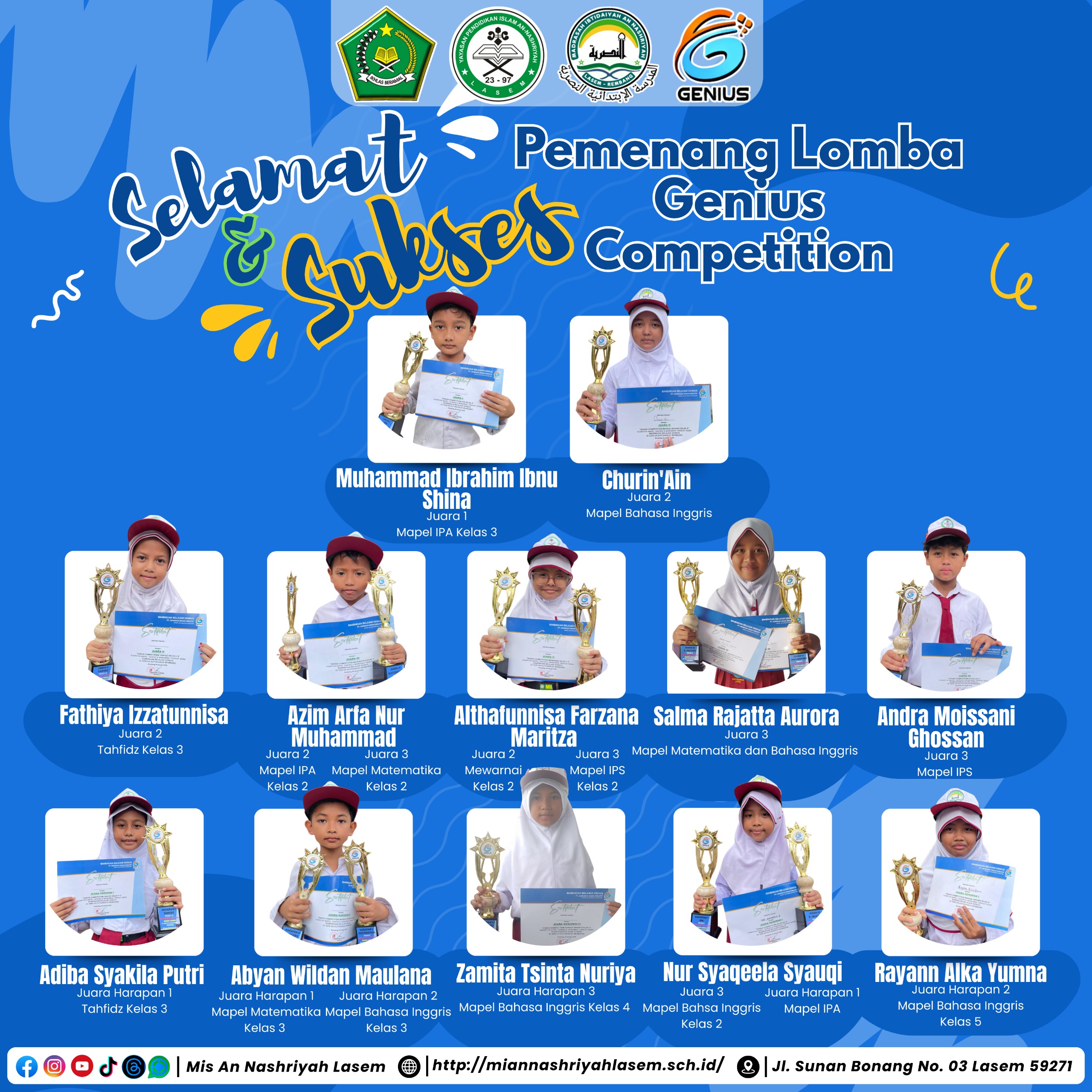 REMBANG – Suasana penuh syukur dan haru menyelimuti kontingen sekolah hari ini. Dalam ajang bergengsi Lomba Genius yang digelar di Rembang, putra-putri terbaik kita berhasil menorehkan prestasi gemilang di berbagai bidang, mulai dari tahfidz, sains, hingga seni.